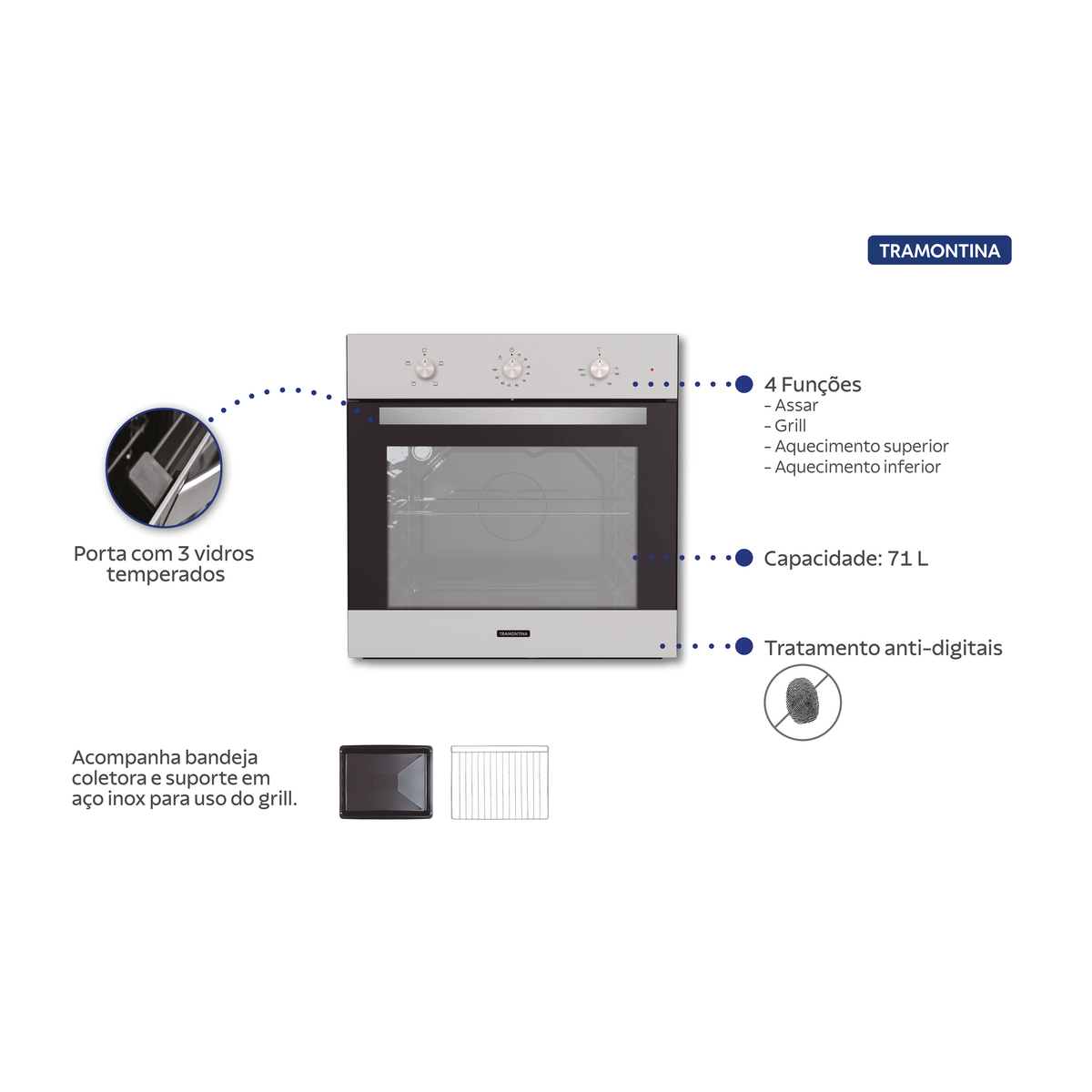 Para preparar suas receitas com muita qualidade e ainda aproveitar todos os espaços da sua cozinha com maior eficiência, o forno elétrico de embutir Tramontina Inox Basic 60 F4 em aço inox 4 funções 71 litros é indispensável. Com um design que une bom gosto e estilo, ele possui capacidade para 71 litros e quatro funções de cozimento. Sua instalação é simples e se adapta aos mais variados projetos, podendo ser de embutir convencional ou em modo flush, onde o forno fica nivelado ao móvel, dando um acabamento mais discreto e refinado ao conjunto. Com a Tramontina, sua cozinha fica muito mais funcional, completa e com muita qualidade!